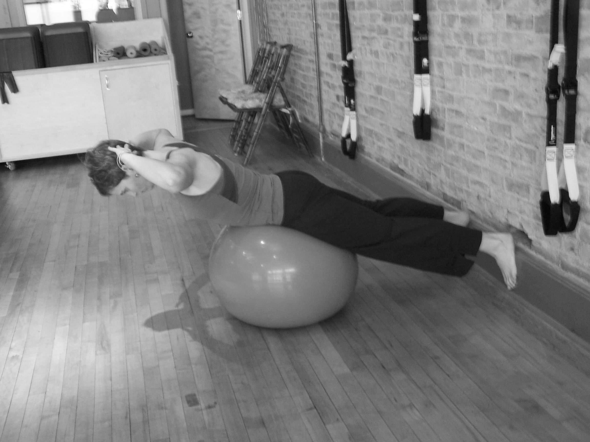 EXHALE: return to starting position, keeping pubic bone pressed into the ball and legs active