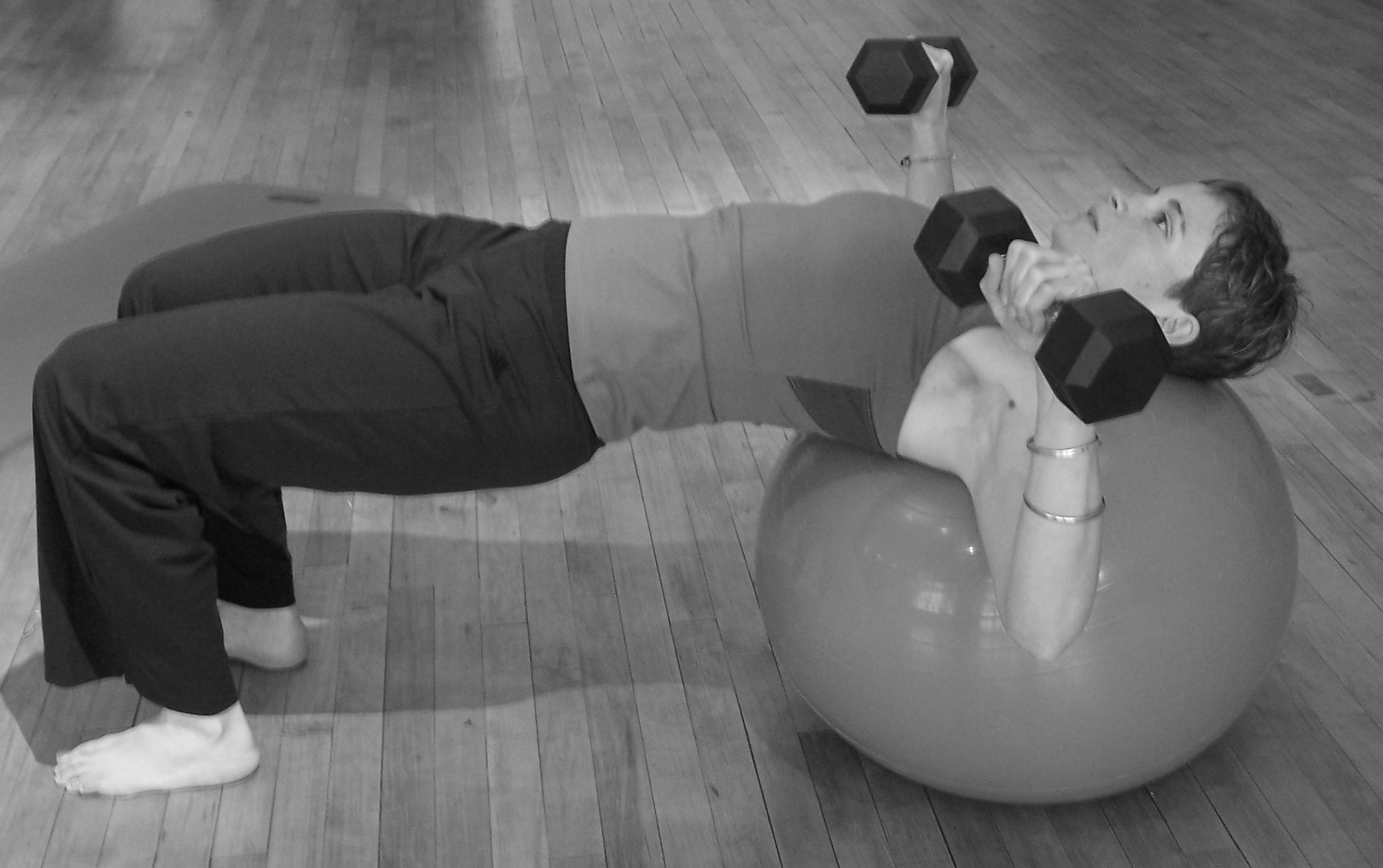 Lie on your stability with your neck and shoulders resting on your ball and your hips lifted in a bridge. Hold dumb bells in your hands.