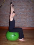 Sit on a stability ball or bench with feet hip distance apart. Hold dumbbells in your hands, 3-5 pounds is fine. Bring arms up so there is a 90-degree angle at the elbow.