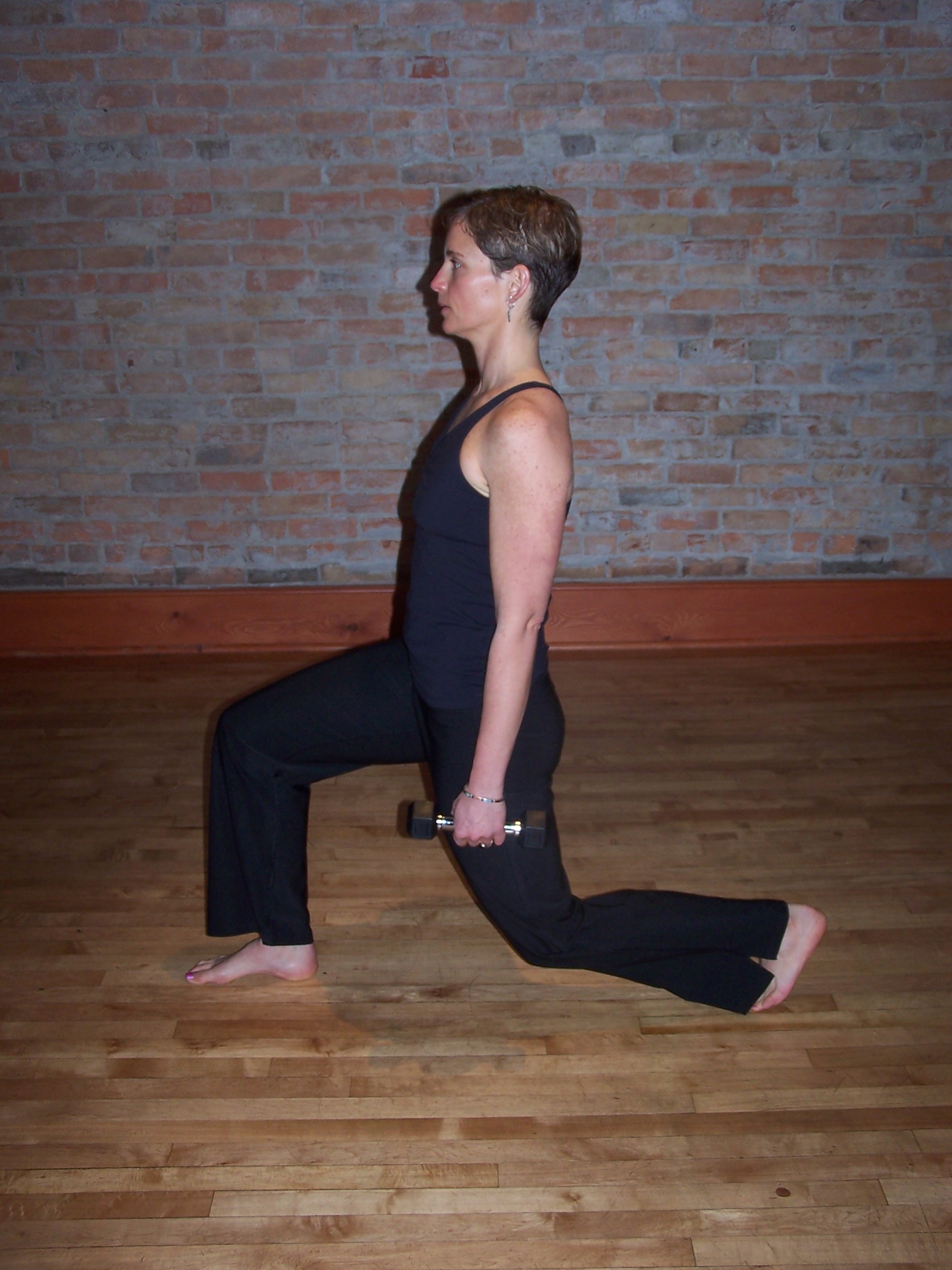 Stand next to a wall for added support. Stand with left leg forward right leg back, hip distance apart. Be sure to keep the pubic bone forward to prevent an arch in the low back.