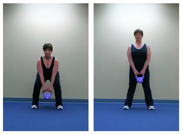 Standing with feet a little wider than hip distance apart, hold the bell handle with both hands, arms straight and relaxed. Bend from the hips as if sitting in a chair, squat deeply with knees over toes, keep the chest up, and the heels on the ground. Exhale as you come up, Inhale as you descend.