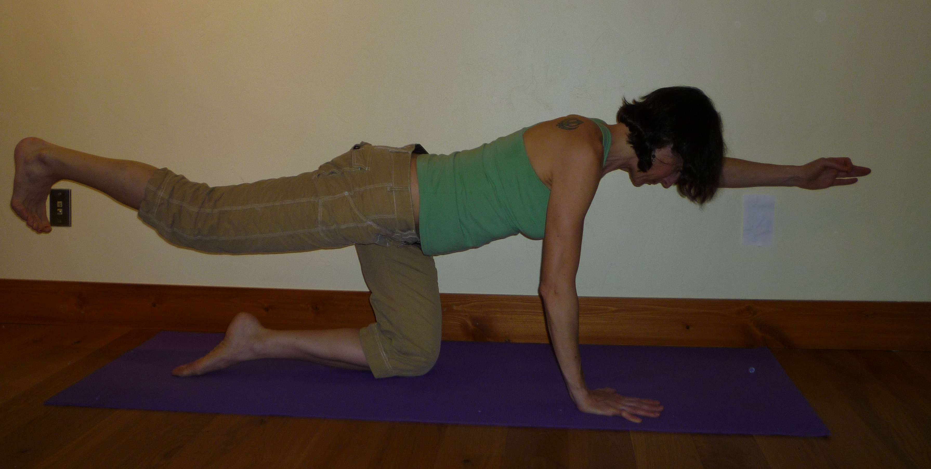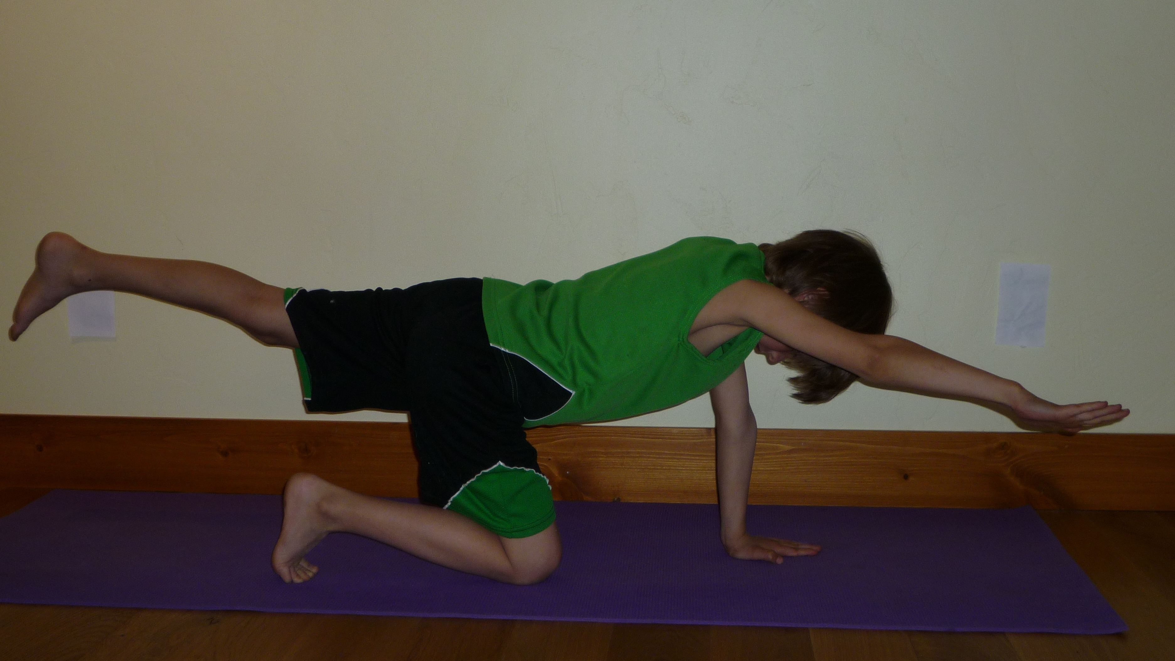 Balancing Cat – This posture builds confidence and enhances focus, concentration, and balance. It strengthens muscles along the spine, arms, shoulders, and opens the hips.