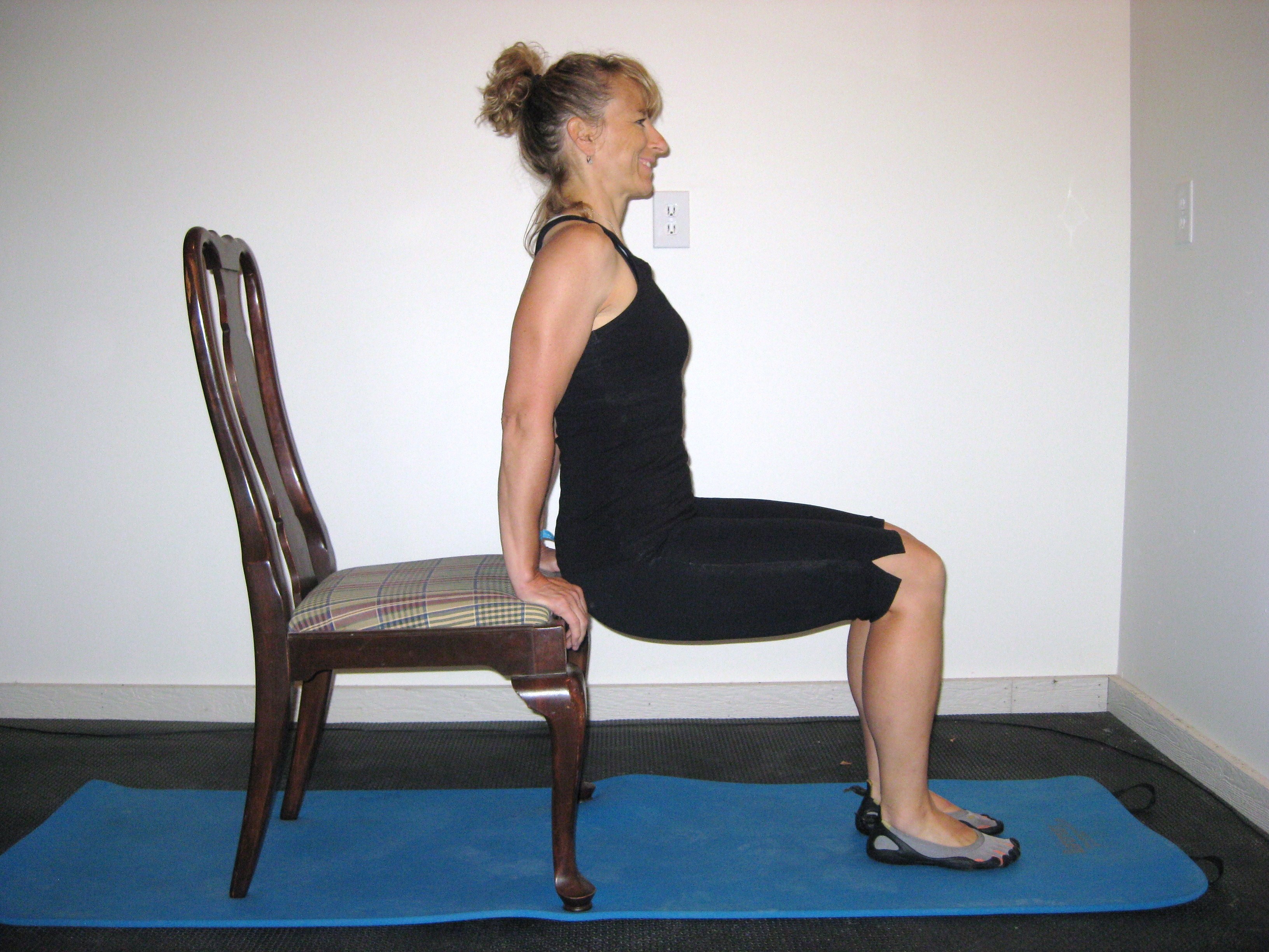 Start with feet hip width apart, sit on the edge of a chair or bench, place hands on each side (no more than shoulder width apart), knees at 90 degrees, and neutral spine alignment. Slide slightly off the chair or bench so you can slowly lower your buns toward the floor keeping your alignment, inhale on the way down. Exhale forcefully to engage your core as you begin to press up back into the starting position. Remember speed is not your friend. Start with 8-12 repetitions.