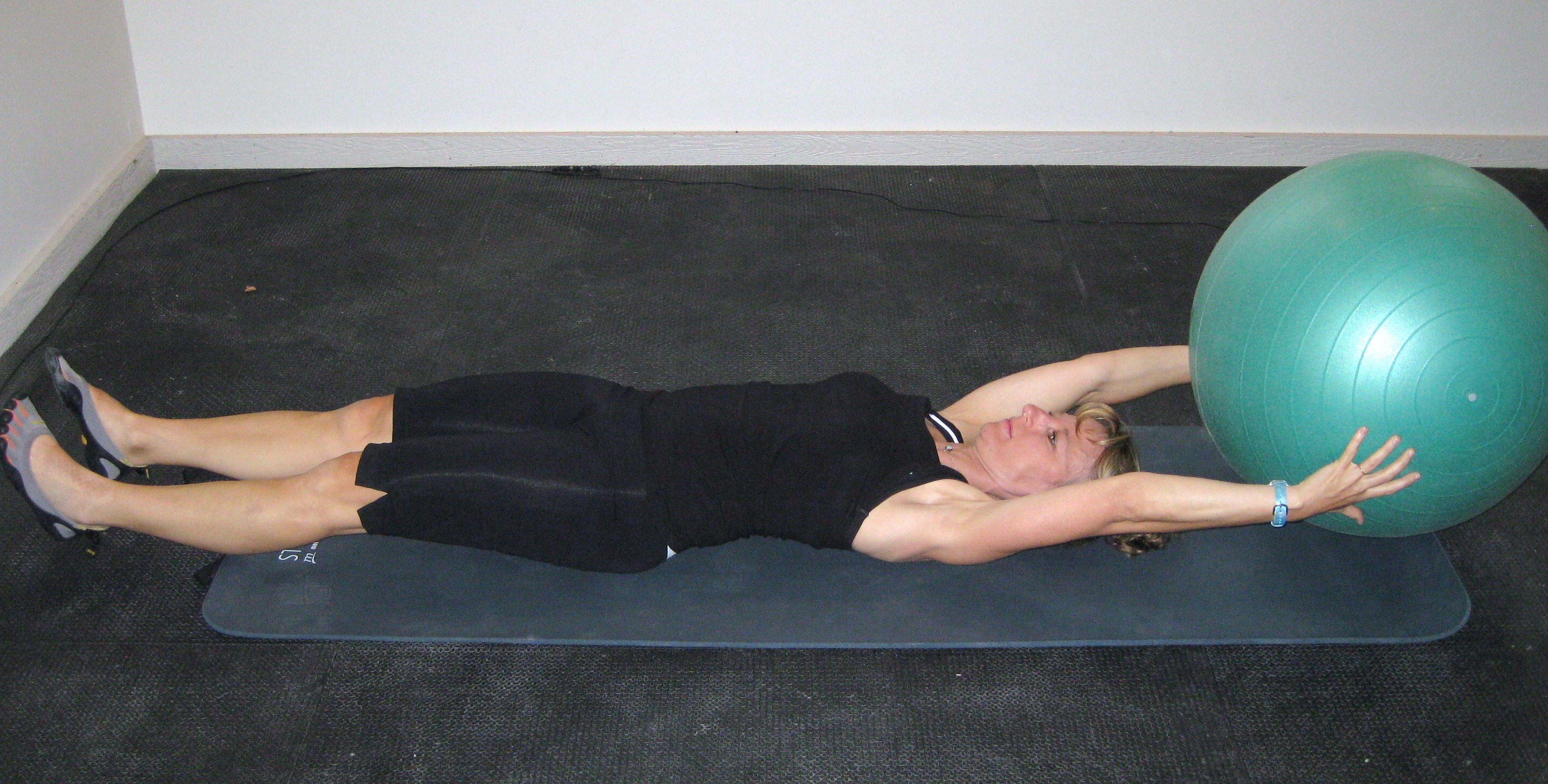 Start in the supine position with exercise ball between your hands, exhale forcefully as you lift your legs and arms (with the ball) at the same time, pass the ball from your hands to between your feet, lower your arms and legs at the same time. Exhale forcefully as you lift your legs (with the ball) and arms at the same time, pass the ball from your feet to your hands and return to your starting position. This exercise is core intensive so you may need to start with your spine imprinted and work up to remaining in neutral spine throughout the entire exercise. The pass from hands to feet and back equals one repetition. Start with 6-8 repetitions.