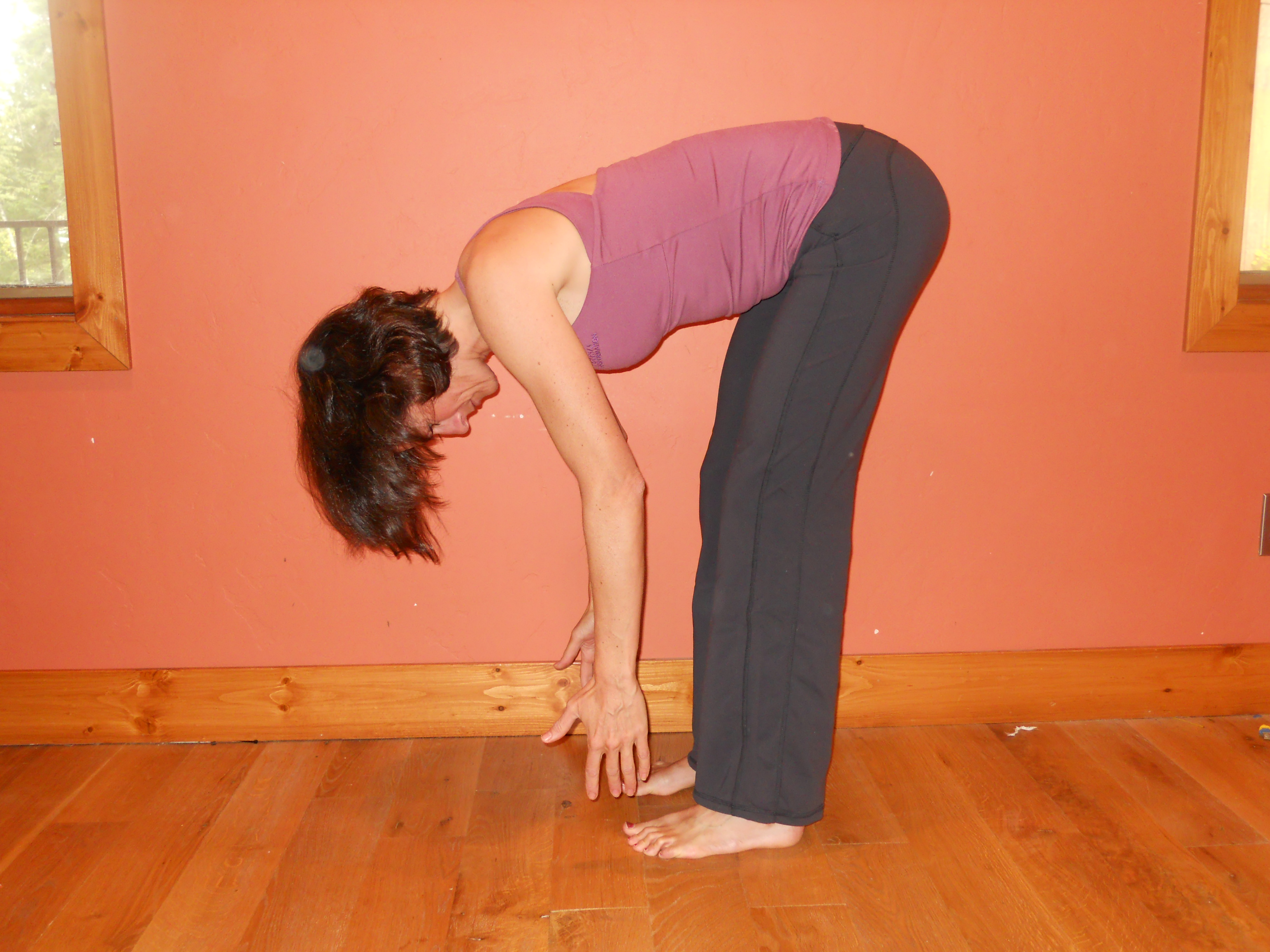 2) If possible, with your knees slightly bent, bring your palms or finger tips to the floor slightly in front of or beside your feet, or bring your palms to the backs of your ankles. If this isn’t possible, cross your forearms and hold your elbows. Press the heels firmly into the floor and lift the sitting bones toward the ceiling. Let your head hang and your neck relax. Turn the top thighs slightly inward.