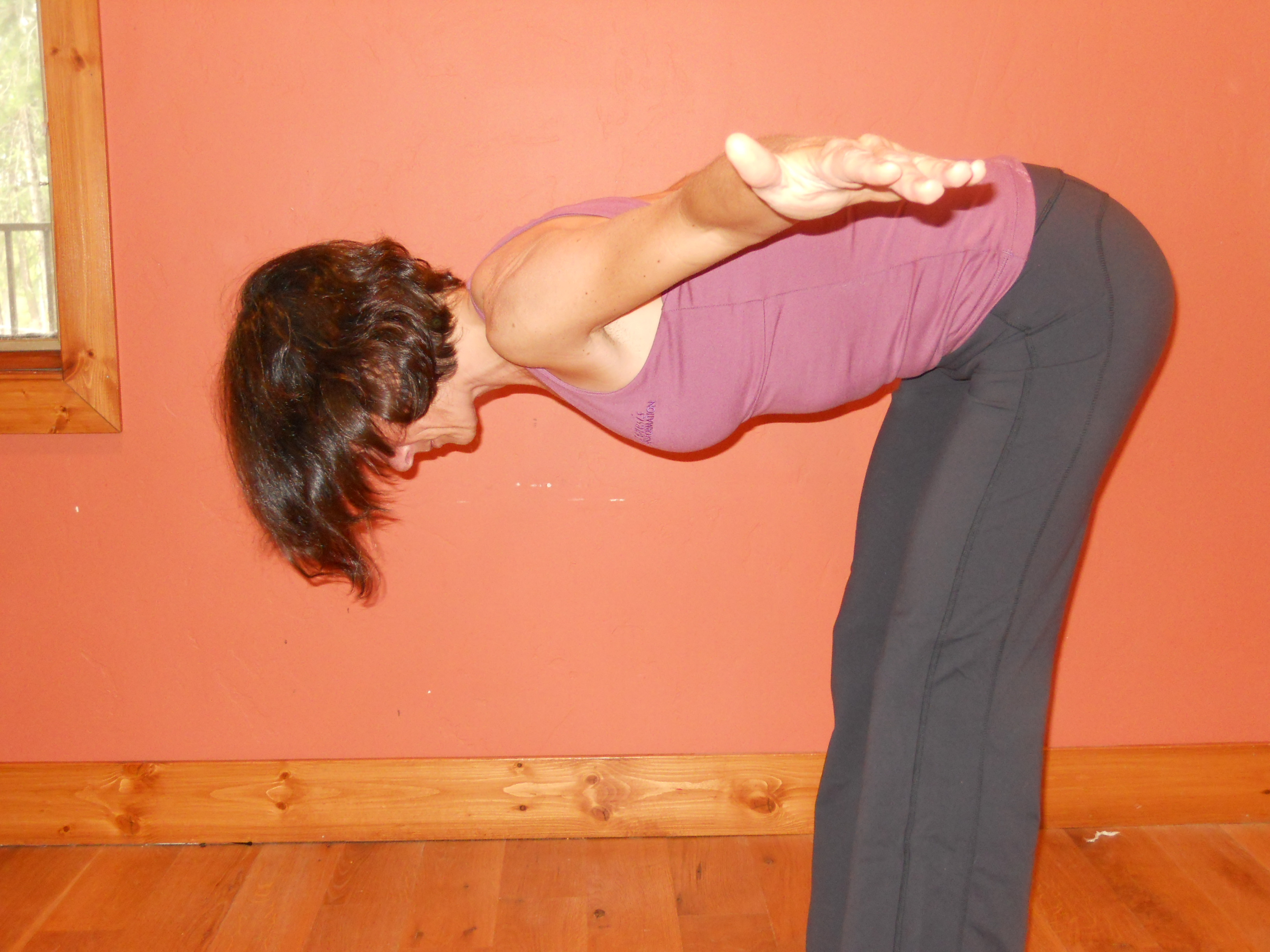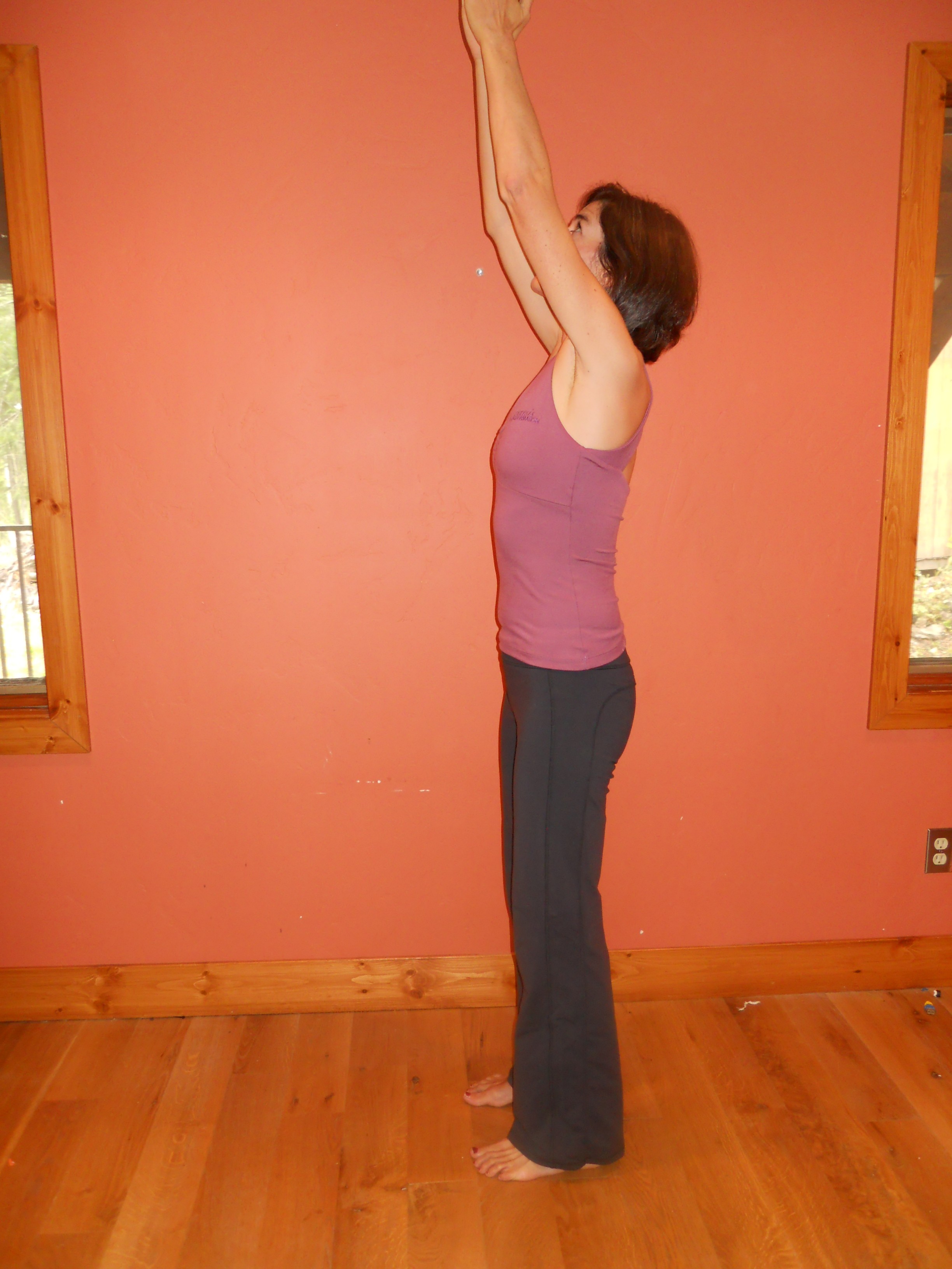 1) Stand in Tadasana (Mountain Pose). Inhale and lift arms overhead reaching towards the sky. Exhale and bend forward from the hip joints, not from the waist. Emphasize lengthening the front of the torso as you fold forward.