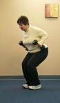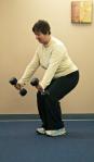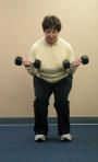 With the weights by your sides, sit down in a squat position. Hold the position and curl the weights up to your shoulders at the same time. Return the arms to your side and stand back up. Repeat 12 times.