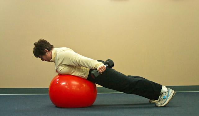 This is a great stabilization exercise for the entire body. The primary muscles used to perform the plank are the transverse abdominus, erector spinae and obliques. The arm muscles used are the posterior deltoid, infaspinatus, teres major and minor, and latissimus dorsi. To perform this exercise correctly; Drape over the ball with your hands on the floor and knees on a mat. Draw you navel in and lengthen your legs out and find your balance. Then pick up the dumbbells and reach them out toward your hips. Make sure the body is in a straight line and that the head is in line with the spine.