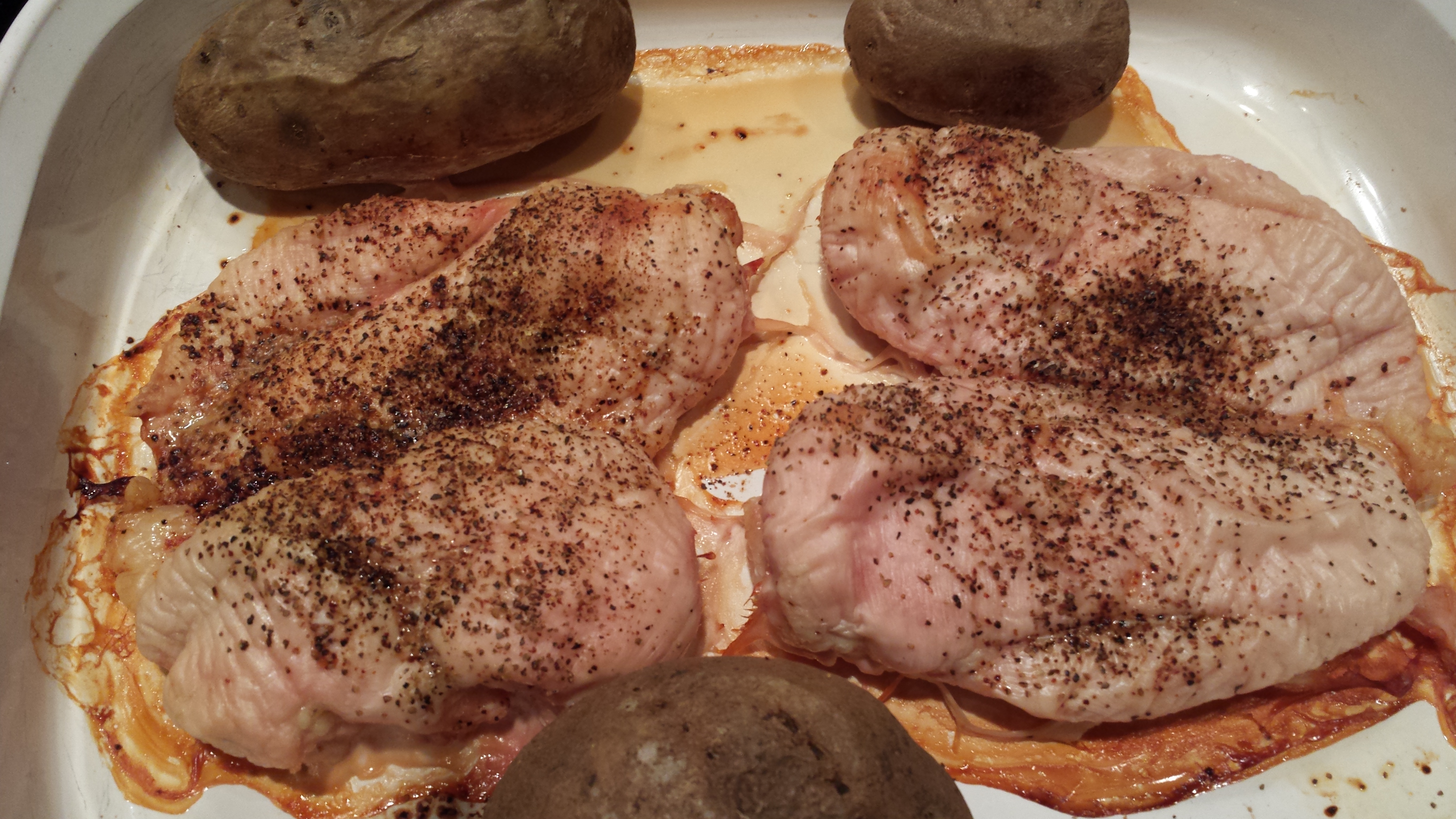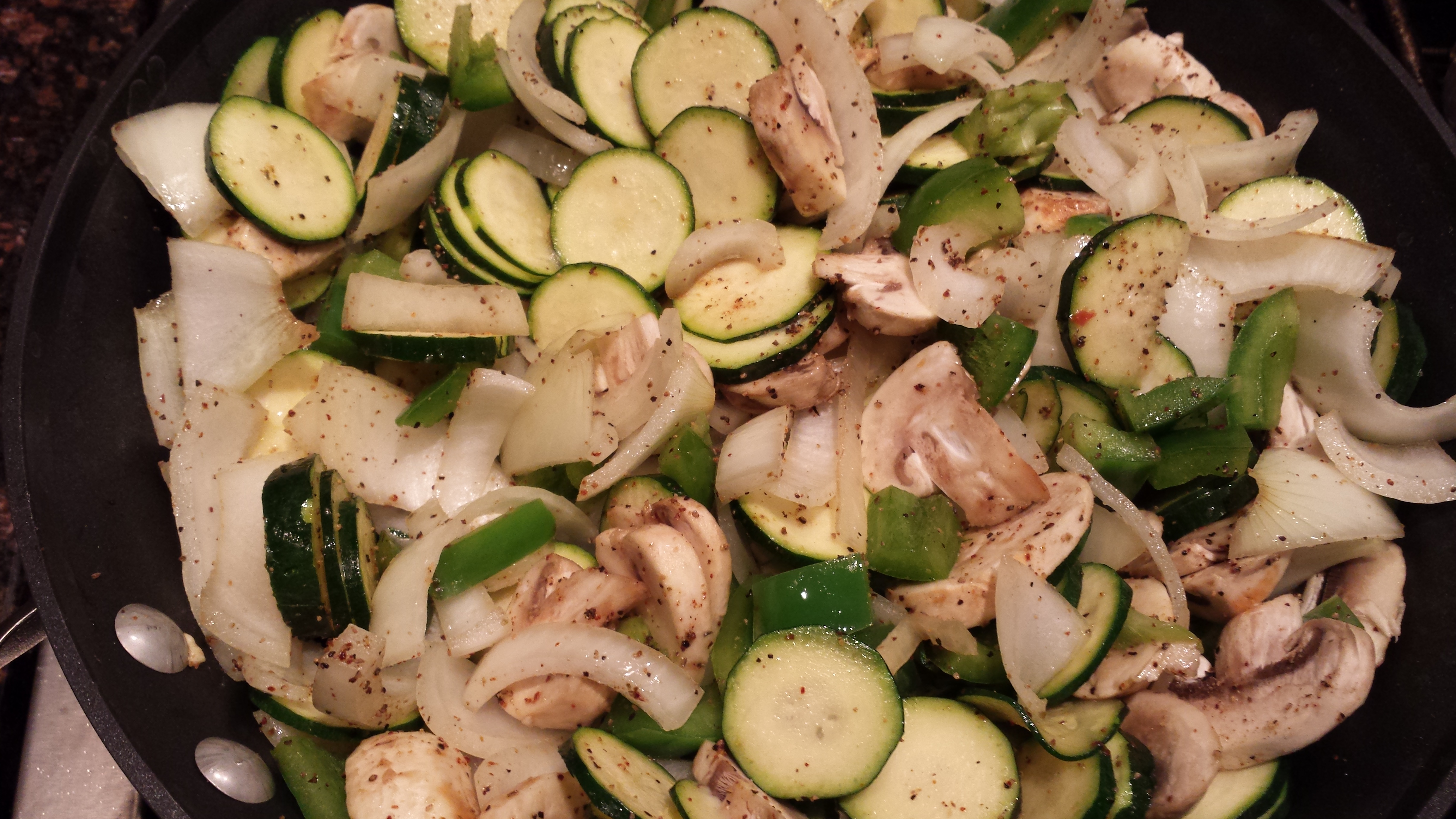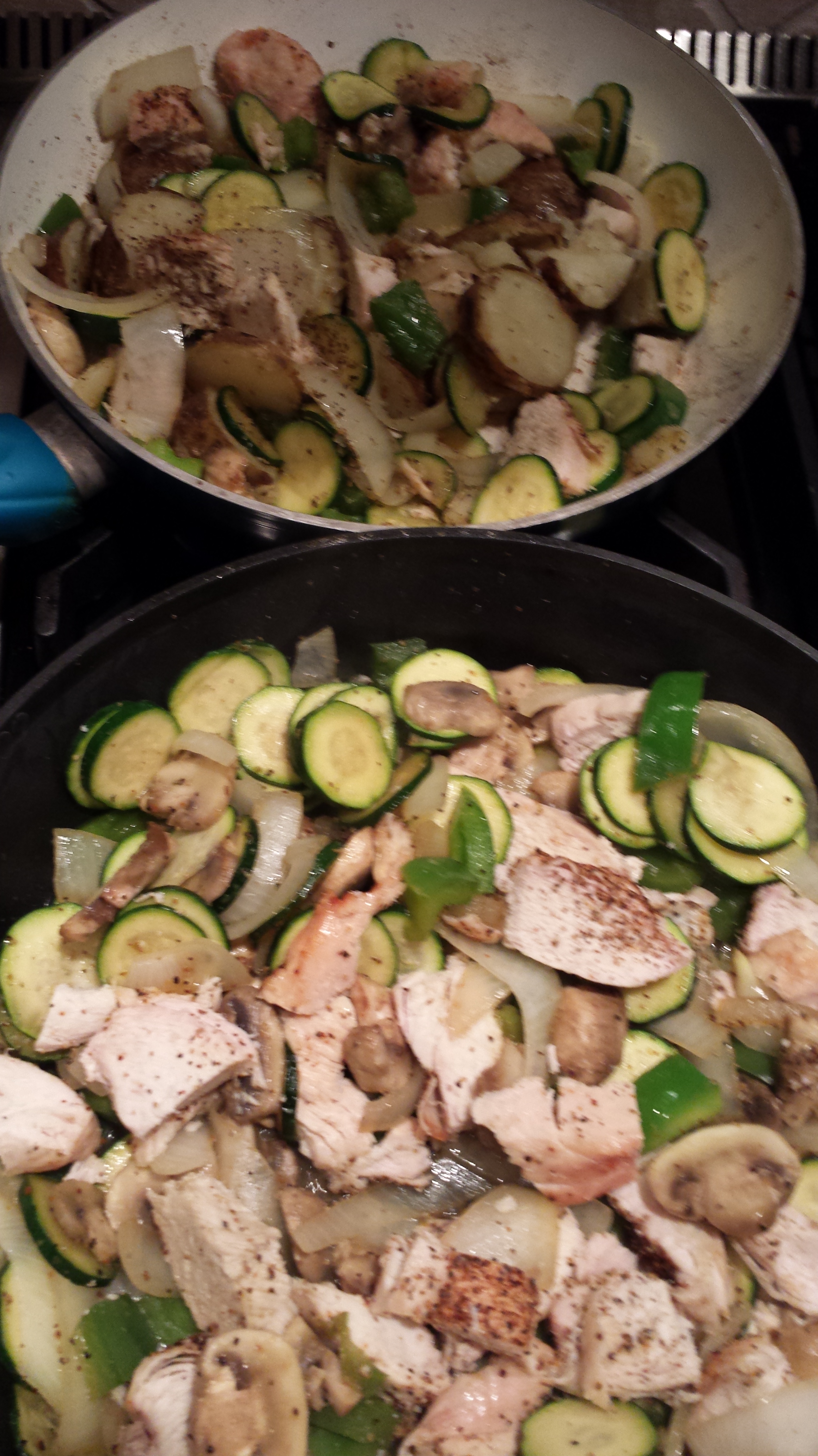 Last night we had a group call for our 4 month lifestyle makeover, it was 40 minutes long. Just prior to getting on the call – I put 4 chicken breast and 3 baked potatoes in the oven. By the time our Q&A group call was over my chicken was just about done. I diced zucchini, onion, bell pepper and mushrooms, threw into a pan with coconut oil and pulled my chicken out.