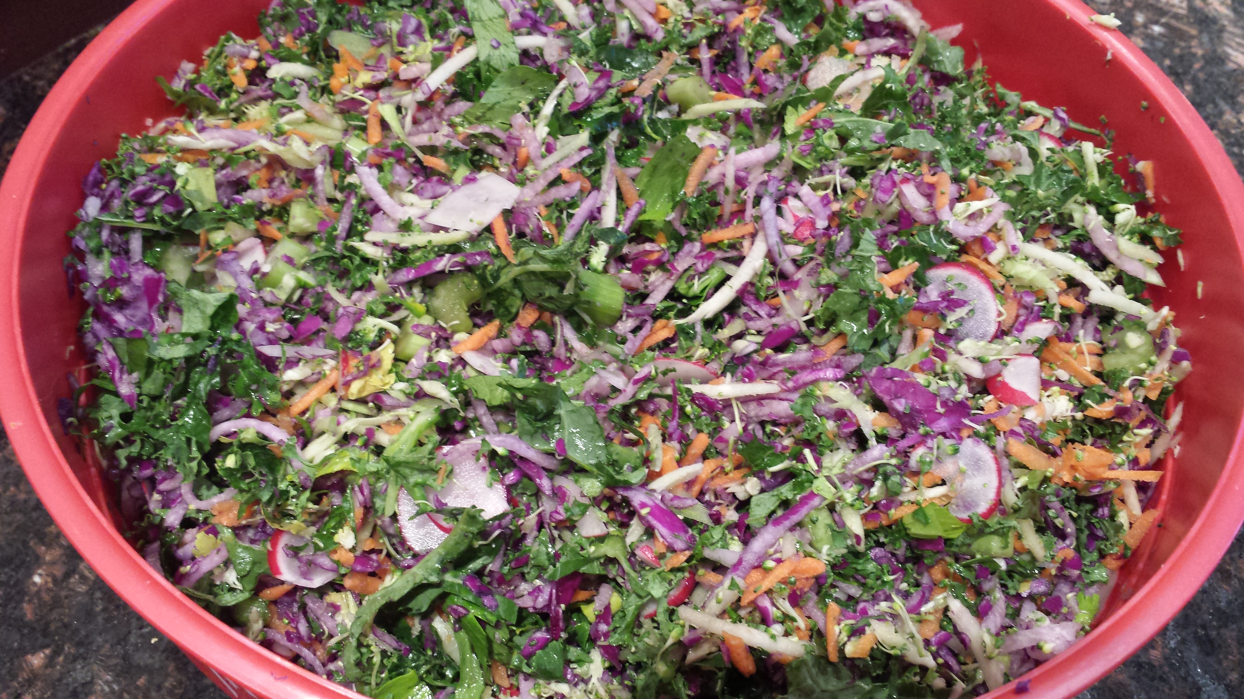 Directions: Shred, dice and mix together. Easy at that! I use my food processor with the shredding blade for carrots, jicama and broccoli; the single slicer for kale, radish & cabbage; and hand chop both the celery & bell pepper. Mix together in a LARGE container. You’ll be surprised at how much salad you just made! This will take the headache out of being creative during the work week, while keeping you on track towards building healthy habits.